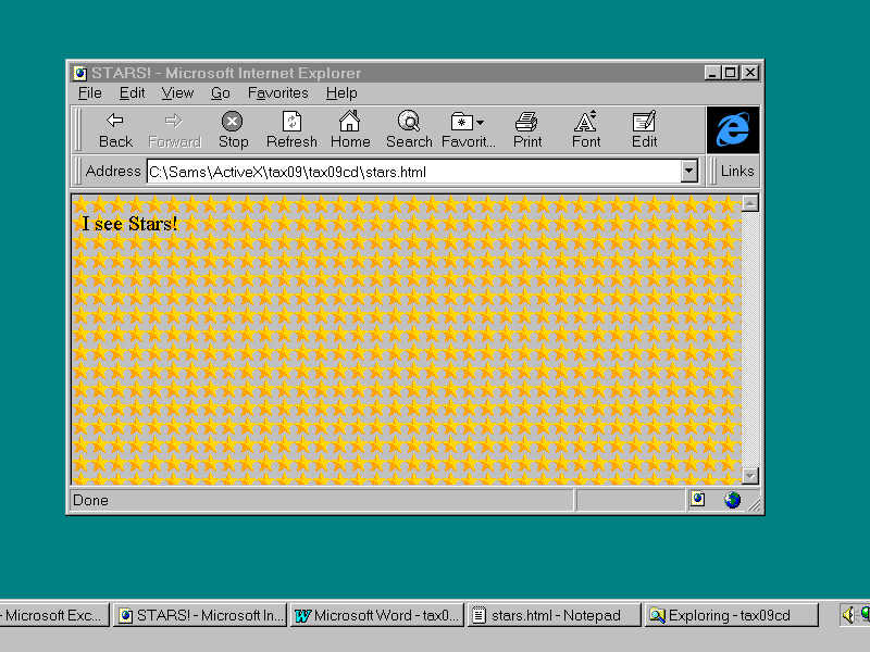 <BODY> tags . <HTML> <HEAD> <TITLE>STARS!</TITLE> </HEAD> <BODY BACKGROUND = "GoldStar.gif"> I see Stars! </BODY> </HTML> The result of Listing 2.4 is shown in Figure 2.5. Figure