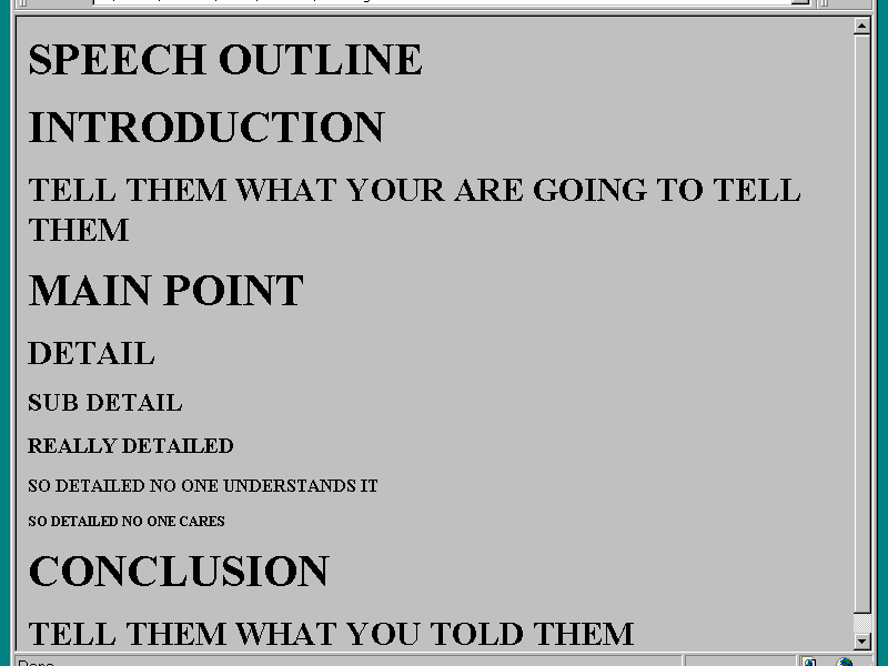 <HTML> <HEAD> <TITLE>SPEECH</TITLE> </HEAD> <BODY> <H1>SPEECH OUTLINE </H1> <H1>INTRODUCTION </H1> <H2>TELL THEM WHAT YOUR ARE GOING TO TELL THEM</H2> <H1>MAIN POINT</H1> <H2>DETAIL</H2> <H3>SUB DETAIL</H3> <H4>REALLY DETAILED</H4> <H5>SO DETAILED NO ONE UNDERSTANDS IT</H5> <H6>SO DETAILED NO ONE CARES</H6> <H1>CONCLUSION</H1> <H2>TELL THEM WHAT YOU TOLD THEM</H2> </BODY> </HTML> This example shows another common use for heading