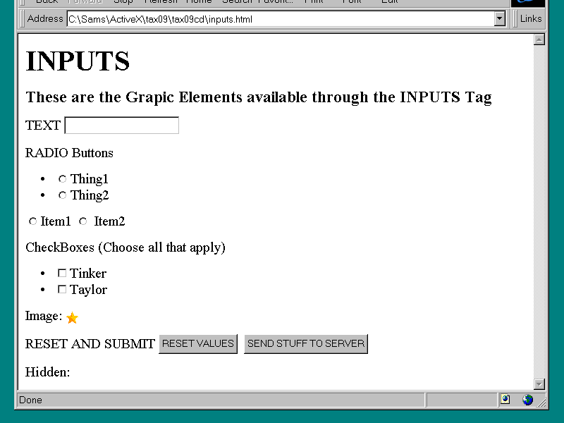 and <INPUT> work together to collect data and pass data back to the server. Listing 2.12. Sample source code for <INPUT>