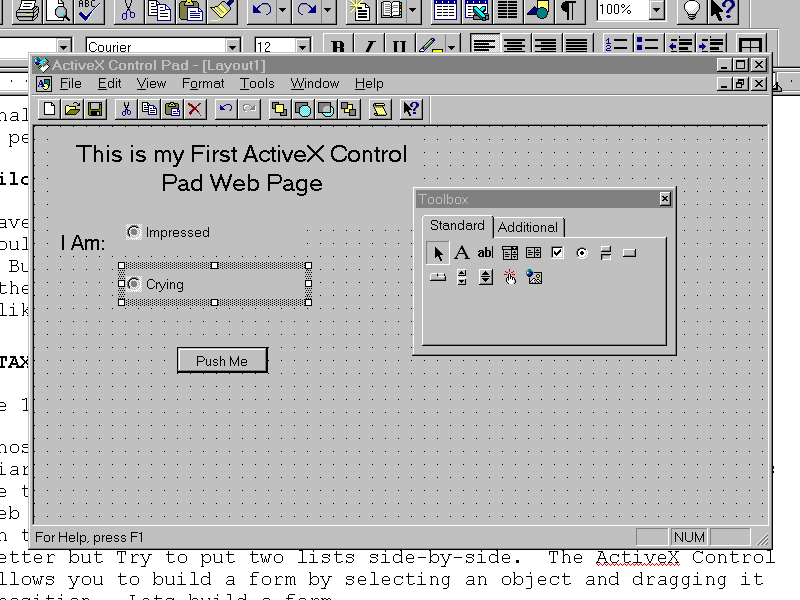 The ActiveX Control Pad enables you to build a form by selecting an object and dragging it
