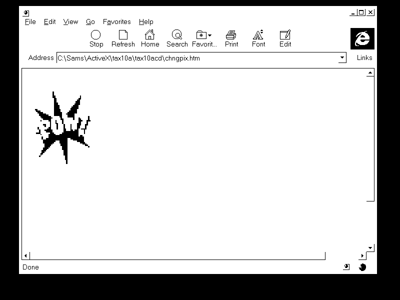 | <HTML> <HEAD> <SCRIPT LANGUAGE="JavaScript"> <!-- var MyTimer var PicState function ChangePic() { if (PicState=1) { chngpix_alx.Image1.PicturePath = "pow.gif"; Picstate = 2; } else { chngpix_alx.Image1.PicturePate = "caution.gif"; Picstate = 1; } MyTimer = window.setTimeout('ChangePic()', 50000)} --> </SCRIPT> <SCRIPT LANGUAGE="JavaScript" FOR="window" EVENT="onLoad()"> <!-- MyTimer = window.setTimeout('ChangePic()', 500); PicState = 1; --> </SCRIPT> <SCRIPT LANGUAGE="JavaScript" FOR="window" EVENT="onUnload()"> <!-- window.clearTimeout(MyTimer) --> </SCRIPT> <TITLE>New Page</TITLE> </HEAD> <BODY> <OBJECT CLASSid="CLSID:812AE312-8B8E- 11CF-93C8-00AA00C08FDF" |