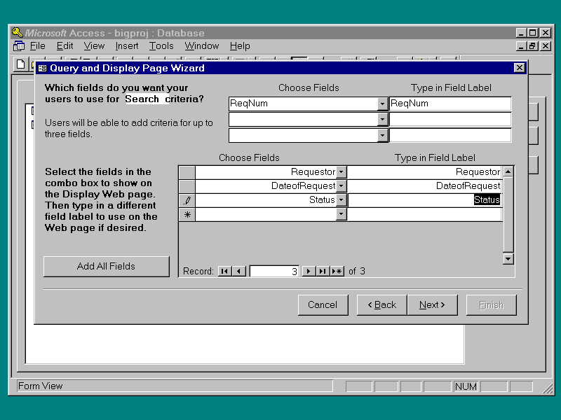 a unique tracking number from the field ReqNum. In the Access database bigproj.mdb, this