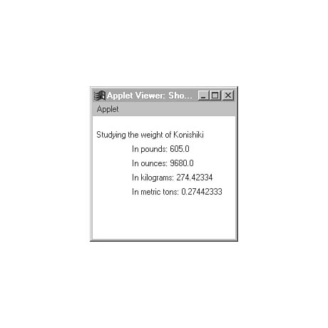 This hour's workshop project has little practical value, except perhaps as a taunting device. The ShowWeight applet takes a person's weight and displays it under several different units. The applet takes two parameters: a weight in pounds and the name of the person who weighs that amount. The weight is used to figure out the person's weight in ounces, kilograms, and metric tons, and all of these are displayed.