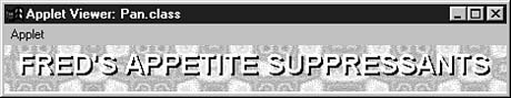When you use appletviewer to load this Web page, you will see the Fred's Appetite Suppressants banner shown in Figure 23.1. No foreground element is specified on the page, so the text appears over a moving background.