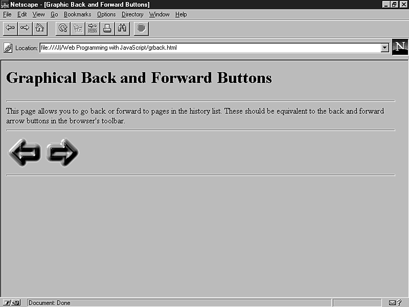 <HTML> <HEAD><TITLE>Graphic Back and Forward Buttons</TITLE> </HEAD> <BODY> <H1>Graphical Back and Forward Buttons</H1> <HR> This page allows you to go back or forward to pages in the history list. These should be equivalent to the back and forward arrow buttons in the browser's toolbar. <HR> <A HREF="javascript:history.back();"> <IMG BORDER = 0 SRC="left.gif"> </A> <A HREF="javascript:history.forward();"> <IMG BORDER = 0 SRC="right.gif"> </A> <HR> </BODY> </HTML>