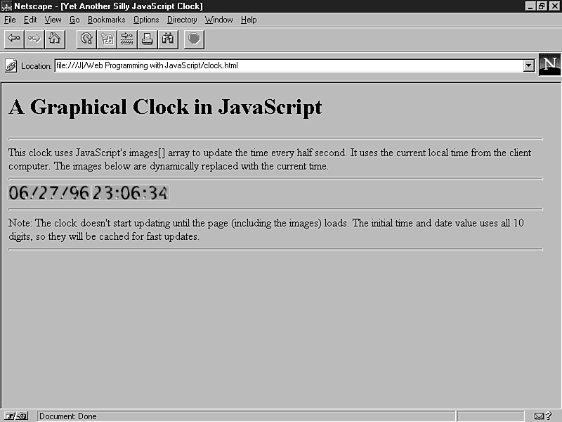 Listing 12.3 shows the HTML and JavaScript source for the clock program, and Netscape's view of it is shown in Figure 12.3.