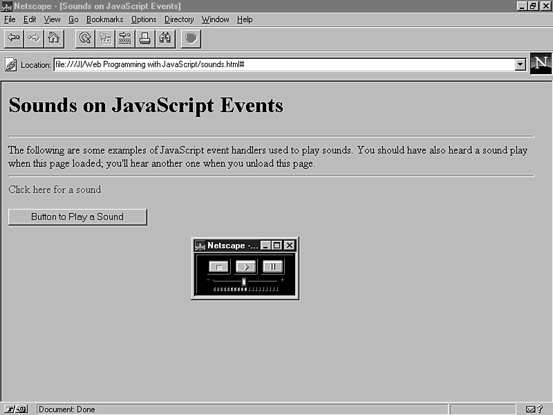 <HTML> <HEAD> <TITLE>Sounds on JavaScript Events</TITLE> <SCRIPT LANGUAGE="JavaScript"> function playsound(sfile) { // load a sound and play it window.location.href=sfile; } </SCRIPT> </HEAD> <BODY onLoad="playsound('zap.wav');" onUnload="playsound('click.wav');" > <H1>Sounds on JavaScript Events</H1> <HR> The following are some examples of JavaScript event handlers used to play sounds. You should have also heard a sound play when this page loaded; you'll hear another one when you unload this page. <HR> <a href="#" onClick="playsound('zap.wav');"> Click here for a sound </a> <FORM NAME="form1"> <INPUT TYPE="button" VALUE="Button to Play a Sound" onClick="playsound('click.wav');"> </FORM> </BODY> </HTML>