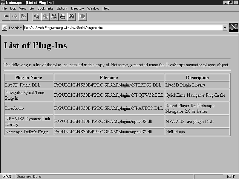 This program should be easy to understand. It uses the navigator.plugins.length property to determine the number of plug-ins. For each one, it displays table cells containing the properties. Figure 13.2 shows the list generated by this program.