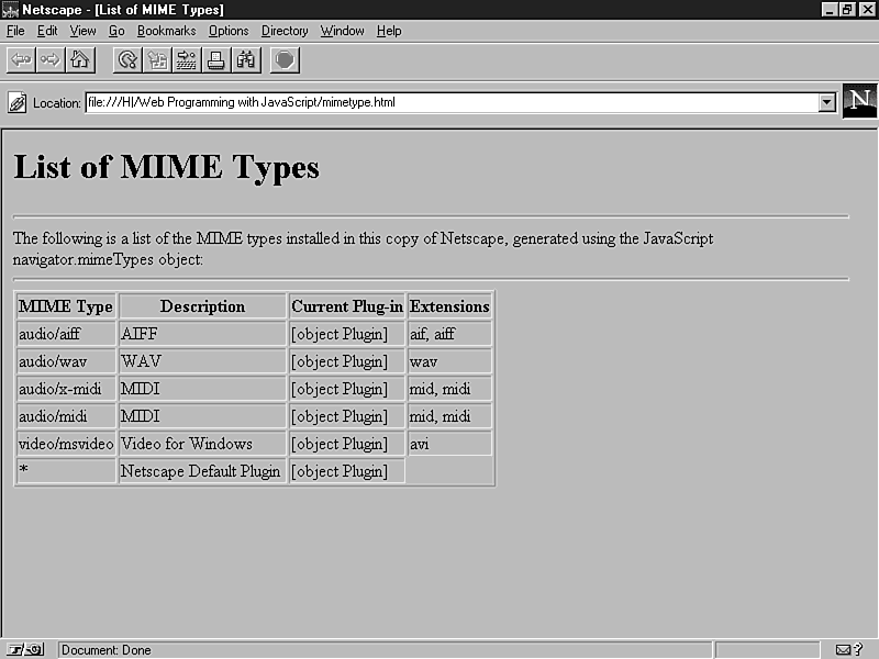 This program works in the same fashion as the previous example. It iterates through the navigator.mimeTypes array and displays the properties for each type. The list generated by this program is shown in Figure 13.3.