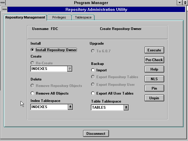 There are two tablespace selection drop-down list boxes. They are included to allow the repository manager to select tablespaces other than the default tablespace setup for the repository owner. It will also allow for separation of the repository