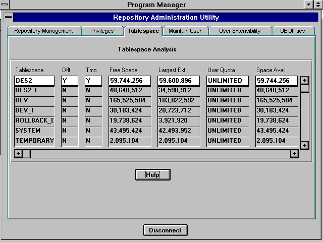 This tab screen, as seen in Figure 24.4, shows an overview of the tablespaces the repository owner has access to. This will be an important place for the repository manager to monitor the space requirements of the repository. The utility also identifies