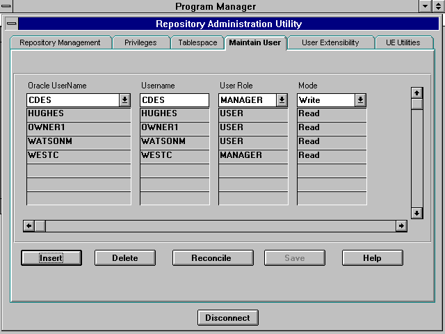 There are also two modes that can be assigned to users, READ and WRITE. The READ mode gives read-only access to the repository via the Designer/2000 tools. The WRITE mode gives full read and write access to the repository via the Designer/2000 tools.