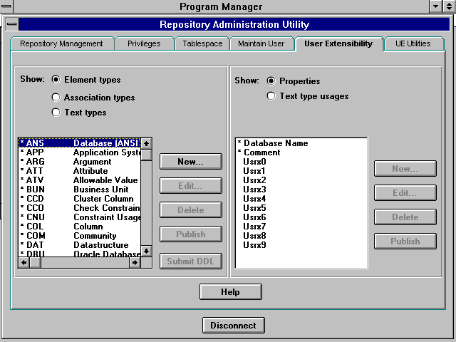 The second way to extend the repository is to add new properties or text type usages to existing types. To do this either edit one of the Usrx objects and edit the properties or select the New button and select an existing type to add. Once this