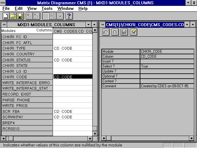property sheet. Items in the property sheets can then be edited. The columns and rows of the matrix can be added and deleted, and three different views can be shown based on preferences set. The matrix report can also be printed out, but in some cases the