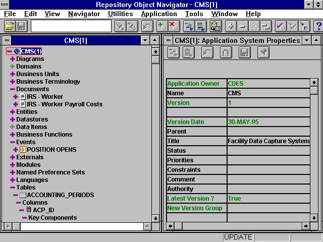 Repository Object Navigator, sometimes referred to as RON. New to this tool is the use of the hierarchy tree display method and the visual basic like property sheet, as seen in Figure 24.9.