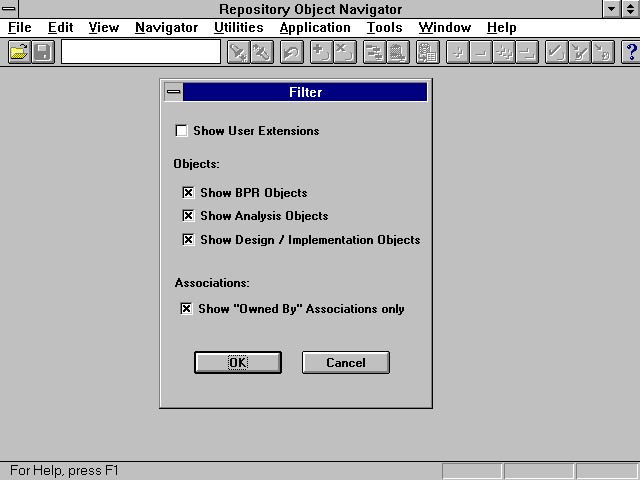 From the initial startup of the Repository Object Navigator, the user has several choices to choose from in the Filter dialogue box, as seen in Figure 24.10. This dialogue will be displayed by default, but can be suppressed by editing the Repository