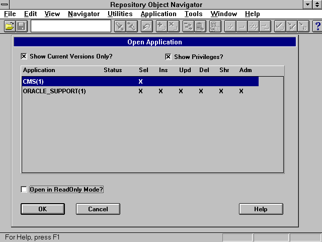The open application dialogue is displayed and will list all applications available in the repository, application versions, and related user security assigned for the application. The user can also specify read-only mode if no changes are intended to