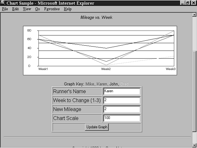 The first control discussed is the chart control for generating graphs. This is another ActiveX control from Microsoft, but it makes use of some types of features that you haven't encountered yet with the other controls. For example, you can associate much larger quantities of data with this object than the other controls because you must provide the data to be graphed to it. The control also offers many more properties than those considered so far. You can assign a variety of properties to make the data representation take on many different forms. This control makes it easy to graph data from your scripts right before your users' eyes.