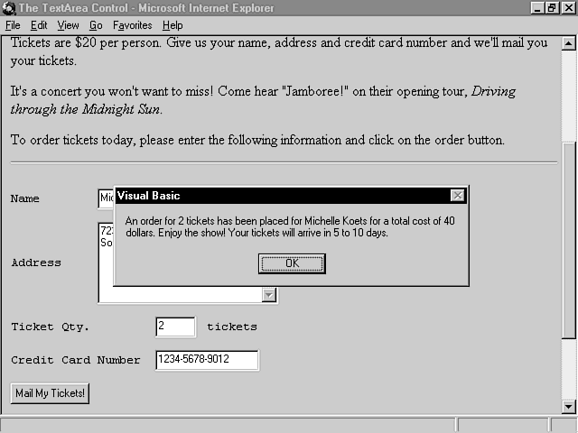 Now that you've seen each control and simple examples of how they work, consider them together in a simple example. Use the familiar example of entering an order-in this case, for concert tickets. This example uses the text control, the textarea control, and the button all together to retrieve data from the user. Figure 8.10 shows the Web page called tickets.asp.