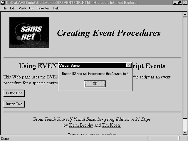 How do you go about connecting the button with VBScript code? Quite easily, in fact. On Day 7, "Building a Home for Your Code," you learned about a special procedure called an event procedure. You saw that event procedures are designed to respond to events initiated by the user, usually on controls. To get your VBScript code to respond to a button click, you have two options. First, you can use the implicit event procedure, which has the following format: