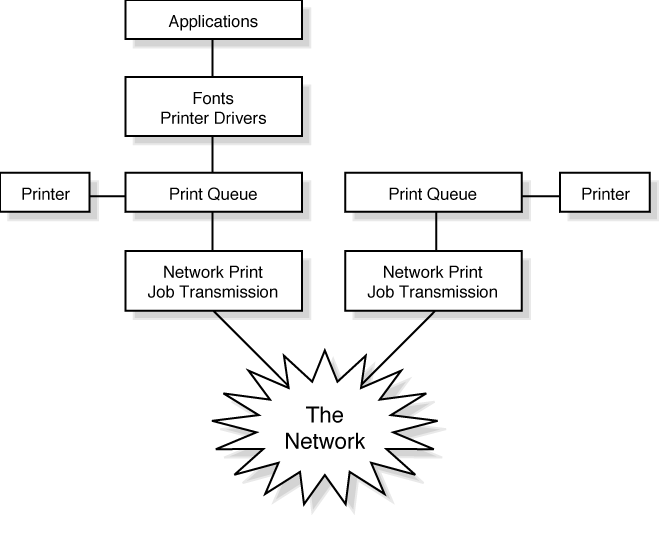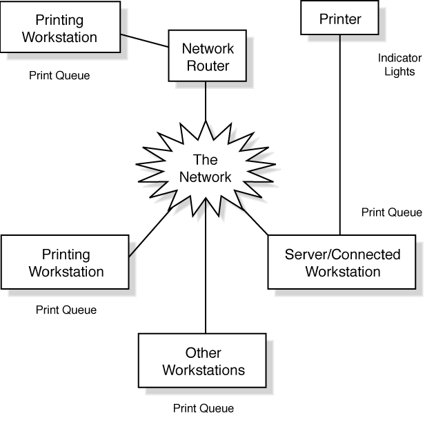 Now imaging a whole network of workstations printing to a series of network printers. When you send your print job, you have no idea as to whether the printer is turned on or working. Therefore, it becomes important to have printing utilities that can determine the status of the printer and feed that back to the users if there are problems. Another issues is how do you coordinate the printing of a number of clients to a printer. If the print queue was located on each of the clients, there would be a question as to who gets the printer next when the current print job completes. This is typically solved by designating the computer to which the printer is attached as a print server which manages the print queue (a list of files waiting to be printed).