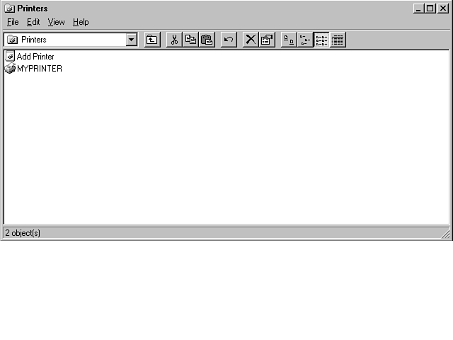 Figure 8.2 shows the window that will greet your when you select the Printers option from the Settings menu. It looks very much like the My Computer or Control Panel utilities, which is nice because you probably already know what each of the buttons does for you. You will always find at least one icon on this display which is the Add Printer icon. This starts the printer setup wizard (a series of panels that ask specific questions to guide you through the printer setup process).