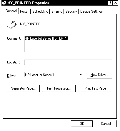 Before I leave this section, let me throw one more thought at you. Many organizations like to name their printers cute names such as naming them after planets or Star Trek characters. While this may make it interesting to people going to select a printer, it may be more practical to name your printers with names that contain two bits of information. This is important in larger organizations which may have dozens or even hundreds of printers attached to their network. The first bit of information is the location of printer. This may include group, floor or building and floor. The next important bit of information is the type of printer. Remember, the remote user is going to have to configure the appropriate printer driver to send the appropriate job streams to this printer. An example of a good name for a larger network printer might be something like MAINT_4SI. This identifies the printer as being in the maintenance department and it is an HP Laserjet 4SI printer. You would have change the name of the printer if you moved it to reflect the new location and some organizations may not want to do this. This is just a thought, but something that you should at least consider.