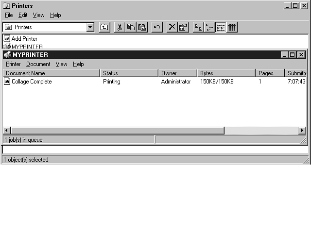I covered the basics of controlling a printer queue earlier in this chapter. Basically, all you have to do is select Settings-Printers from the start menu and then double click on the printer that you wish to manage. You will get a screen similar to Figure 8.4 which displays the current print queue (jobs that have been submitted for print or are in the process of being printed). While this is a good start, I wanted to point out a few additional concepts to help you manage your printers a little bit better.