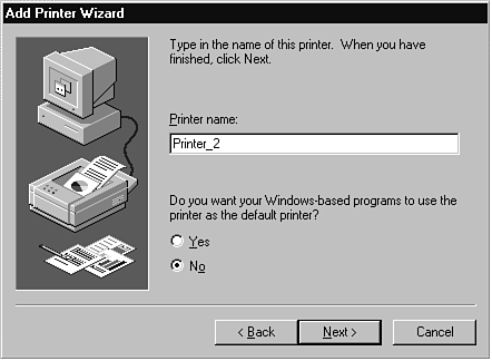 The next panel is really pretty simple (again, this is the type of panel that some people complain about being too simple and therefore making wizards too slow). Figure 8.8 illustrates what I call the printer naming panel. It lets you enter a name for your printer. You get to pick a name that suits your local tastes and standards. I would recommend using meaningful names (location and type of printer) in large organizations, however you can name your printers after craters on the moon if that is what suits you. You also have radio buttons on this panel to indicate whether this will be the default printer for users who use the server as a workstation (like you, the administrator). When you have entered this data, you can press the next button to move onwards in this setup wizard.