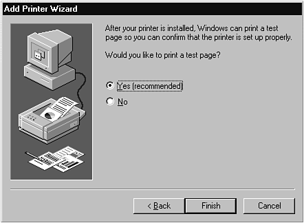 Finally, you are given the opportunity to print a test page before you commit the new printer to your system. I always like to print the test page because it does not really take all that long and it can catch little oddities with drivers or port connections. Figure 8.10 shows the panel used to print the test page. The finish button actually configures the operating system to use this new printer.