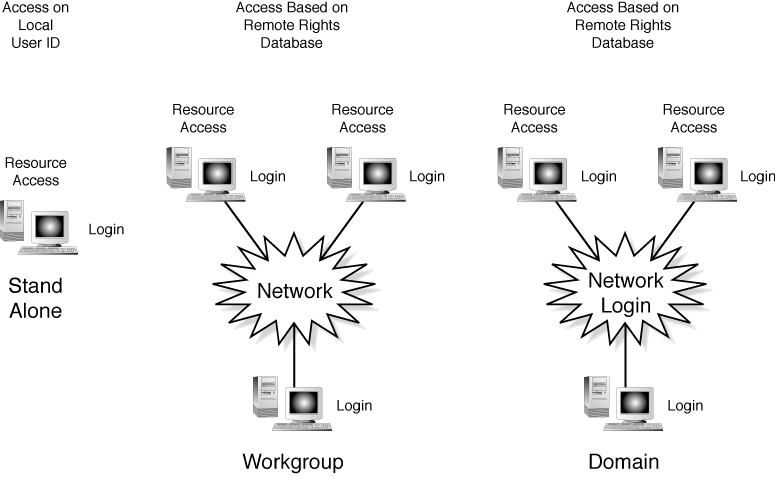 The solution to this is what Microsoft refers to as a domain. One can think of a domain as a secure workgroup with centralized administration. Figure 16.2 shows the different security configurations for a Windows NT network. The key here is that there needs to be a centralized security configuration database that verifies who you are and then relays this information to any other nodes on the network from which you are requesting resource access. For those who serve as administrators, this has the side blessing of providing a single maintenance point for the entire network.