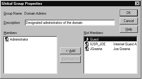 There are a few other minor panels that you can find on the User Manager display, but the ones discussed in this section are the ones that you will need to get your day-to-day job done. Before moving on, there are a few topics to clean up. First are the following groups created by default when you set up a Windows NT 4.0 server: