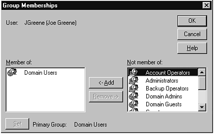 Group Memberships dialog box of User Manager.