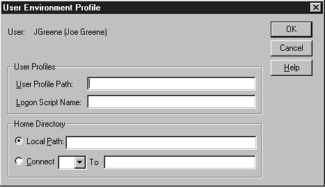 The User Environment Profile is activated by the profile button. Figure 16.8 shows the panel that appears. Be careful not to confuse this button with the User Profile Editor that is provided in the Administrative Tools Start Menu group. The Profile button enables you to select the user profile file (as edited by the User Profile Editor) that applies to this user. It also enables you to specify a logon script that runs every time the user logs onto the system or domain. At the bottom of this panel are fields that enable you to specify the home directory the operating system will use as a default for those times when the applications do not provide their own fully qualified path.