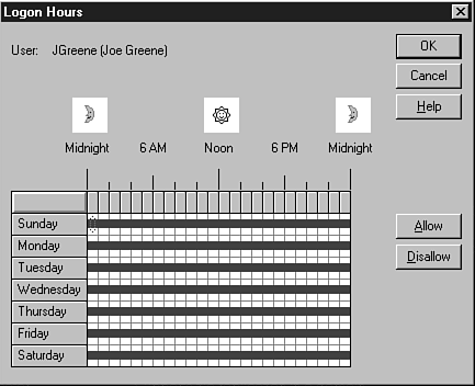 Continuing on with the user environmental parameters that are controlled using from the buttons on the bottom of the User Properties page, you come to the Logon Hours panel (see Figure 16.9). To set the hours of operations, using your mouse, highlight the range of hours with which you want to work and then click the allow or disallow buttons. The sections with the blue lines through the middle are the allowed hours of operation. The sections that are black are the hours in which the user is not allowed to log on. The key here is that these are the hours when the system will allow the logon (connection) process to occur. It does not automatically log off users who are on the system if they are still on the system after the allowed hours.