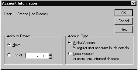The next dialog box that you can access from the buttons at the bottom of the User Properties page controls certain parameters related to the user's account (see Figure 16.11). The first parameter controls when the user's account expires. This usually is implemented as a safeguard to prevent you from forgetting to disable the account of a contractor or permanent employee when they leave. I tend not to use this parameter, but there are some environments in which this parameter might be mandatory (such as access to a computer that requires a security clearance to be updated at regular intervals so that access is not denied). The other parameter enables you to specify whether this is a Global Account (which is the normal account that you create) or a local account for users from non-trusted domains.