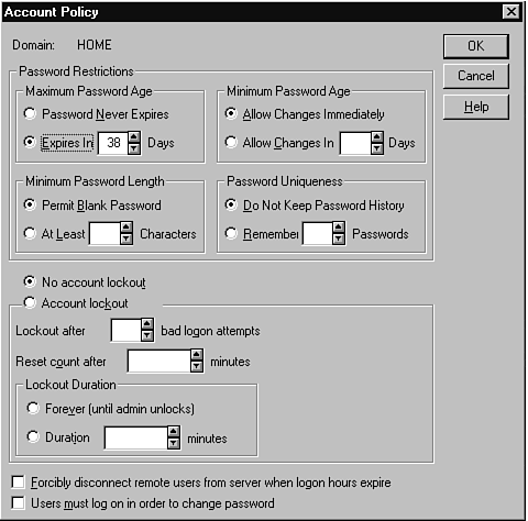 Account Policy dialog box of User Manager.