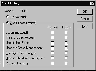 The final policy editor that you will work with sets up the events to be audited by your system. Chapter 24 discusses auditing in greater detail. For now, just look at Figure 16.14. As you can see, you have the option of disabling auditing (you still have the basic security and system event monitoring provided by Event Viewer) or activating only the pieces that interest you.