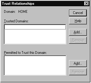 The Trust Relationships dialog box enables you to say that you trust another domain or that you permit another domain to trust you (see Figure 16.15). Remember that both sides must agree to a trust relationship (I trust you and you allow me to trust you) before anything happens with it. You should be sure that you are comfortable with the implications of trust relationships and discuss the setup with the other domain administrators before you set up trust relationships. The key to a successful multiple domain configuration is having an agreed to plan before the network is implemented.