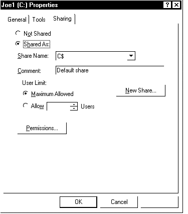So far, we have classified users into groups and set environmental parameters for them. However, they still have next to nothing in terms of shared network resources unless they are connected to their local machines. The other half of the user administration picture is the access grants to resources. This actually is quite simple under the new Windows NT 4.0 interface. For example, to grant a user access to a directory, you follow a simple two-step process. First, you select the directory that is to be shared using Explorer or My Computer tools and create a share name for it. (See Figure 16.20.) The easiest way to create a share name is to highlight the directory of interest and then right-click your mouse and select the sharing option from the pop-up menu appears.