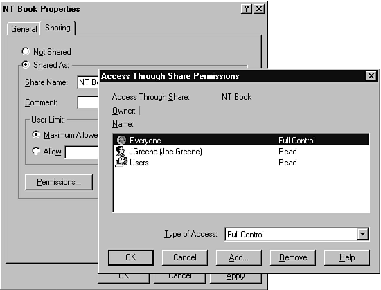 Step two in this process is to select the permissions button on the Sharing tab dialog and fill in the Permissions dialog box. (See Figure 16.21.) This functions like most of the other administrative control tools. To delete permissions, highlight that user and click the Remove button. To add permissions, click the Add button, select first the user or group to give the permission to, and then choose the type of access permission. For files, the permissions are Full Control, which allows directory modification, Read which allows users to look but not touch, Change which allows them to look but not change, and No Access which does not allow them to even look at the list of files.