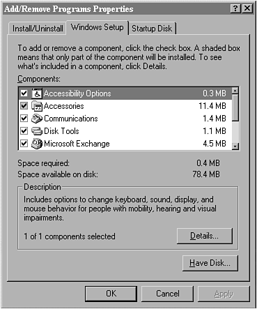 Let me start with the installation process for these utilities. I discuss the Windows 95 version in that it is similar to that used for Windows NT workstations, but perhaps a little more difficult for people who come from the Windows NT environment. In this case, go into Control Panel and select the Add/Remove Programs icon. Add/Remove Programs is designed for operating system programs and not your common applications which typically come with a setup utility. Choose the Windows Setup tab (see Figure 17.2).