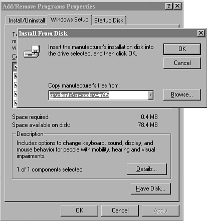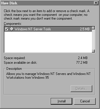 First, you select the Have Disk option, which indicates that you want to install an item that is not on the list. This utility is designed to look for a .INF file, in this case the SRVTOOLS.INF file provided on the Windows NT 4.0 Server CD-ROM. Second, you are prompted to tell the system where the files are located (see Fig. 17.3). In this case, it is the \CLIENTS\SRVTOOLS\WIN95 subdirectory on the CD-ROM drive (in my case it was G:\CLIENTS\SRVTOOLS\WIN95). Windows then loads the product descriptive information from the .INF file