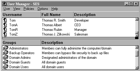 The first tool, User Manager for Domains, is a key point in Chapter 16, User Administration. If you are reading this guide straight through, it should be fresh in your mind. Look at Figure 17.6 to see whether you can find all the differences between this version of the User Manager tool and the one you are used to using on the Windows NT Server console. What impressed me most about this is that it is the same as you would use on your console. There were no changes made to adapt User Manager to the remote computer's environment. Of course, if you are accessing this tool from Windows NT 3.51 workstations, you will get the old look and feel of the Program Manager environment, but the appearance does not affect the basic functionality of the tool itself.