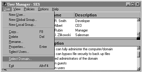 A key concept when working with User Manager tools is the capability to select a domain. Figure 17.7 shows the Select Domain menu option in the far left menu of these utilities. This actually enables you to control one or more entire domains from your personal desktop computer. Remember however, that you will be validated by user ID and password in all domains, so security is still preserved, even when you move around.