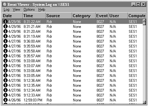 Next on the list of remote administration tools is the Event Viewer. Unlike User Manager, which focuses on the Domain level, the Event Viewer is targeted at specific computers within the domain. The Event Viewer is a tool that enables you to probe the log files of remote systems. These log files contain a wealth of information on both normal operations and problems. Figure 17.8 shows an example of the log that monitors activities for the operating system itself.