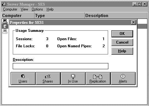 The third tool provided as part of the remote administration package on the Windows NT 4.0 CD is the Server Manager (see Figure 17.9). Like the Event Viewer, it also focuses on the individual computer system level. Its job is to show you what is going on with a particular computer (not just events that are logged). In addition, it displays alerts, which are events that should attract the interest of administrators who do not want to wade through a large number of routine events in the system log files.