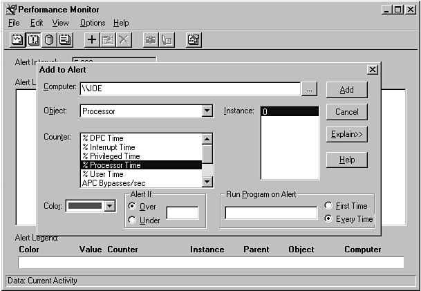 The Performance Monitor is another tool that comes with Windows NT and does not require special configuration or additional software to provide services for multiple computers. The Performance Monitor is built to enable the administrator to select not only the system resource that is to be monitored, but the actual computer system on which the monitoring is to occur. This is useful in that you can have graphs of key actions, such as processor utilization, disk transfer rates, and memory usage running on your personal workstation while you are working on other tasks. Figure 17.10 shows the Add to Alert dialog box you use to select the parameters you want to monitor. The first field in this dialog box is the Computer system name.