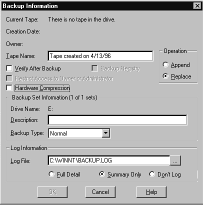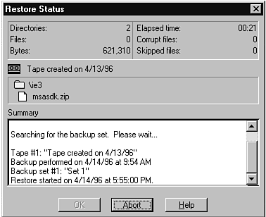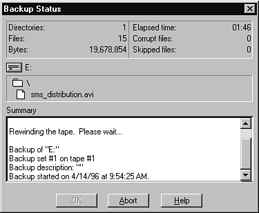 The chapter continued with a discussion about backing up Windows NT. You got some advice on what to look for in choosing a tape backup device for your sever, as well as how to use NTs built-in tape backup program for backing up your server.