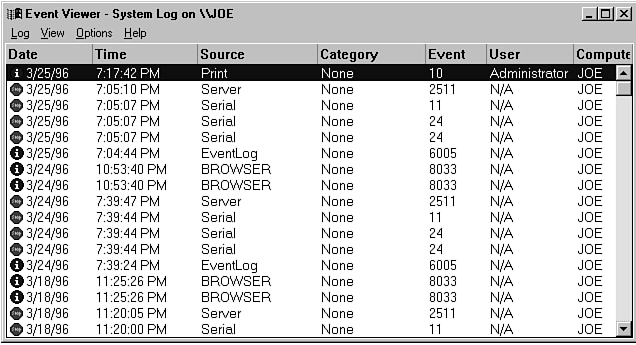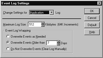 The best way to get used to these logs is to run your system for a while and review the events that get recorded. You should be especially sensitive to the icons displayed on the far left side of the list of events, because these help you sort out the problems from the routine items. The next issue you have to deal with is controlling the event log itself. The control over the size of the data and time it is retained is set using the Log Settings option of the Log menu (see Figure 24.9).